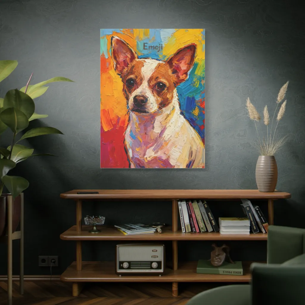 Emoji's Radiant Gaze is a stunning fusion of traditional impasto with a modern digital sensibility. The bold, vibrant strokes create a truly innovative, contemporary pet portrait. Exquisite!