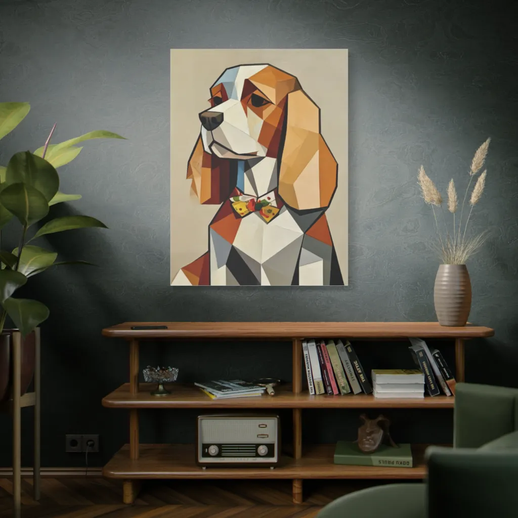 Fallon's dapper bow tie and contemplative stance perfectly capture his unique, thoughtful beagle spirit. His fragmented form reveals a playful soul, ready for delightful, late-night chats. Truly special!