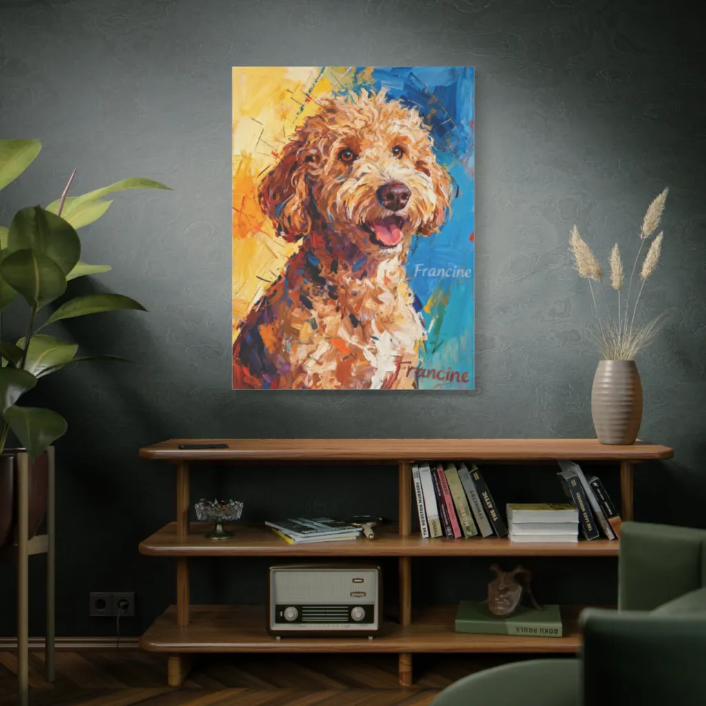 Vibrant impasto strokes depict a cheerful, fluffy dog, bursting with playful energy against a warm, expressive backdrop. Francine, the canvas's shaggy star, looks ready to bound off the wall and share some joyful, tail-wagging zest.