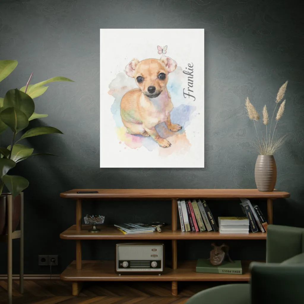 A whimsical watercolor captures a wide-eyed chihuahua puppy, its sweet innocence beaming amidst a cheerful splash of pastel hues.