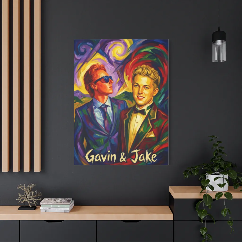 “Gavin and Jake: Chromatic Study” masterfully employs vibrant, saturated hues, contrasting cool shades for Gavin with warm, energetic tones for Jake. The chromatic harmony and bold strokes brilliantly capture their confident, suave energy.
