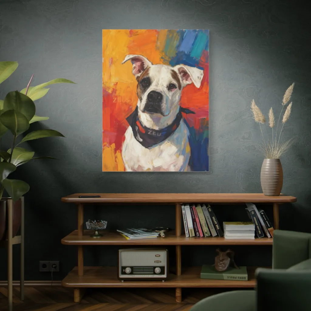 Bold impasto strokes capture a charming dog's loyal gaze amidst a vibrant, expressive backdrop, creating a delightfully spirited mood.