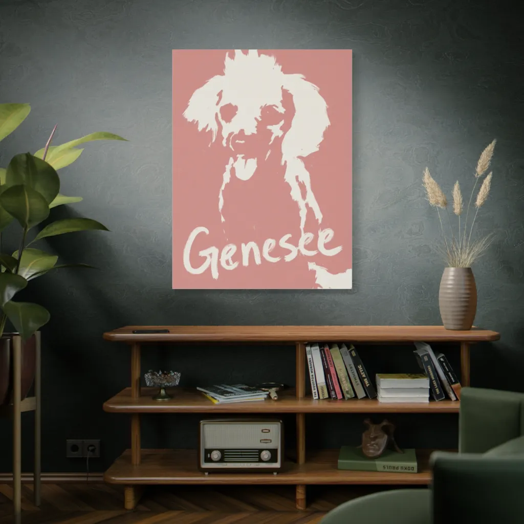Bold, brushy strokes create a charming pop-art portrait of a fluffy dog, exuding playful and modern affection. Genesee, the playful pop-art pup, beams with fluffy charm, perfectly styled in peachy keen tones.