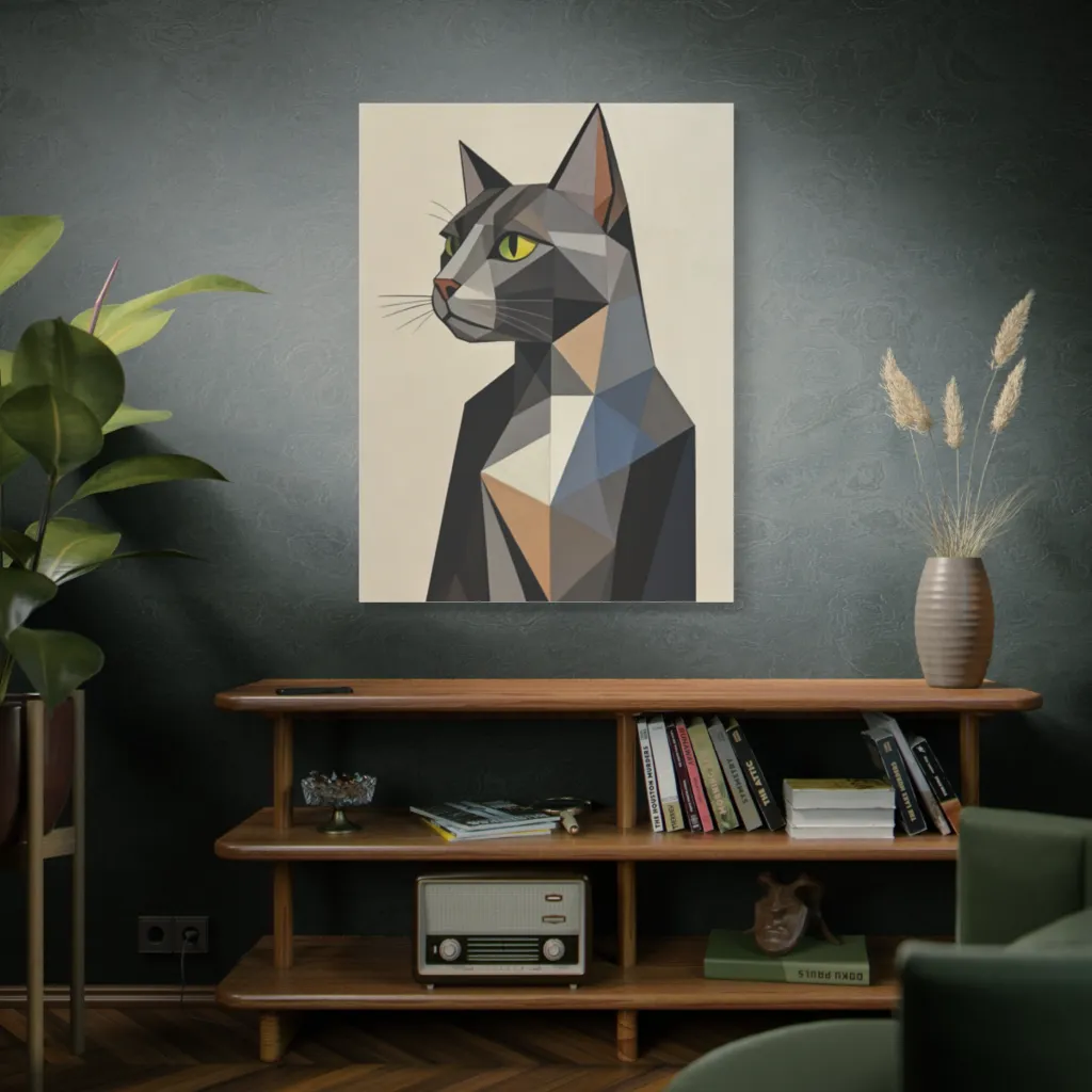 Geometric gray fragments capture a stoic cat's watchful gaze, radiating sleek, modern elegance.