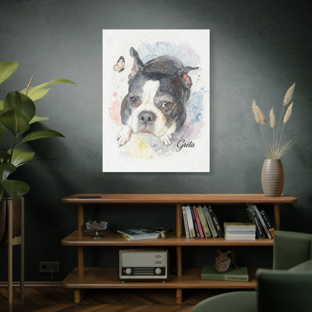 This whimsical watercolor captures Greta, a curious Boston Terrier, gazing adorably at a butterfly amidst vibrant, playful splashes, creating a truly heartwarming mood.