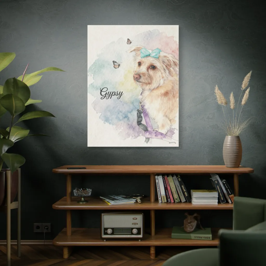 A whimsical watercolor portrait captures a fluffy dog with a bow, framed by soft pastels and fluttering butterflies, creating an endearing mood.