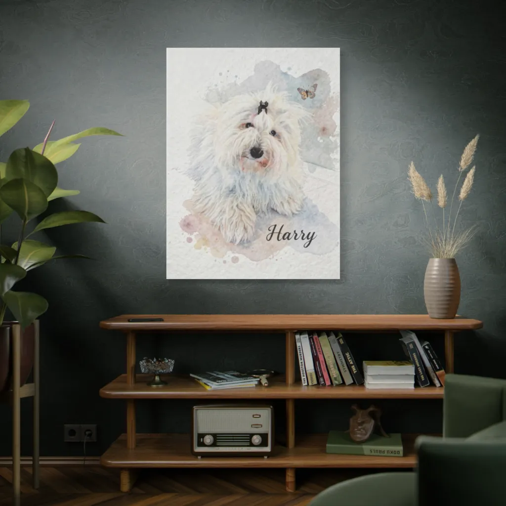 A whimsical watercolor portrait captures a fluffy white dog, looking utterly charming amidst soft washes and a playful butterfly. Harry, the fluffy wonder, stares with puppy-dog eyes, contemplating a graceful butterfly dance above his head.