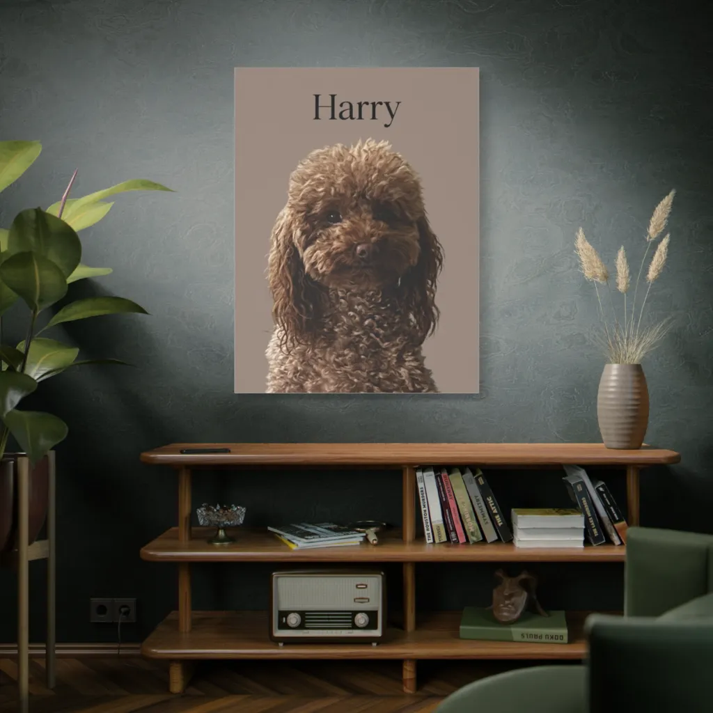 This minimalist portrait beautifully captures a curly-coated canine with an endearing focus, emphasizing its rich, textured charm. Harry, ever the sophisticated fluffball, poses with a dignified intensity, perhaps pondering his next treat.