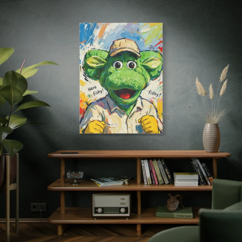This impasto portrait of a jubilant green character, cap askew, playfully shouts "Here fishy!" with vibrant, thick strokes, capturing an eager, whimsical mood.