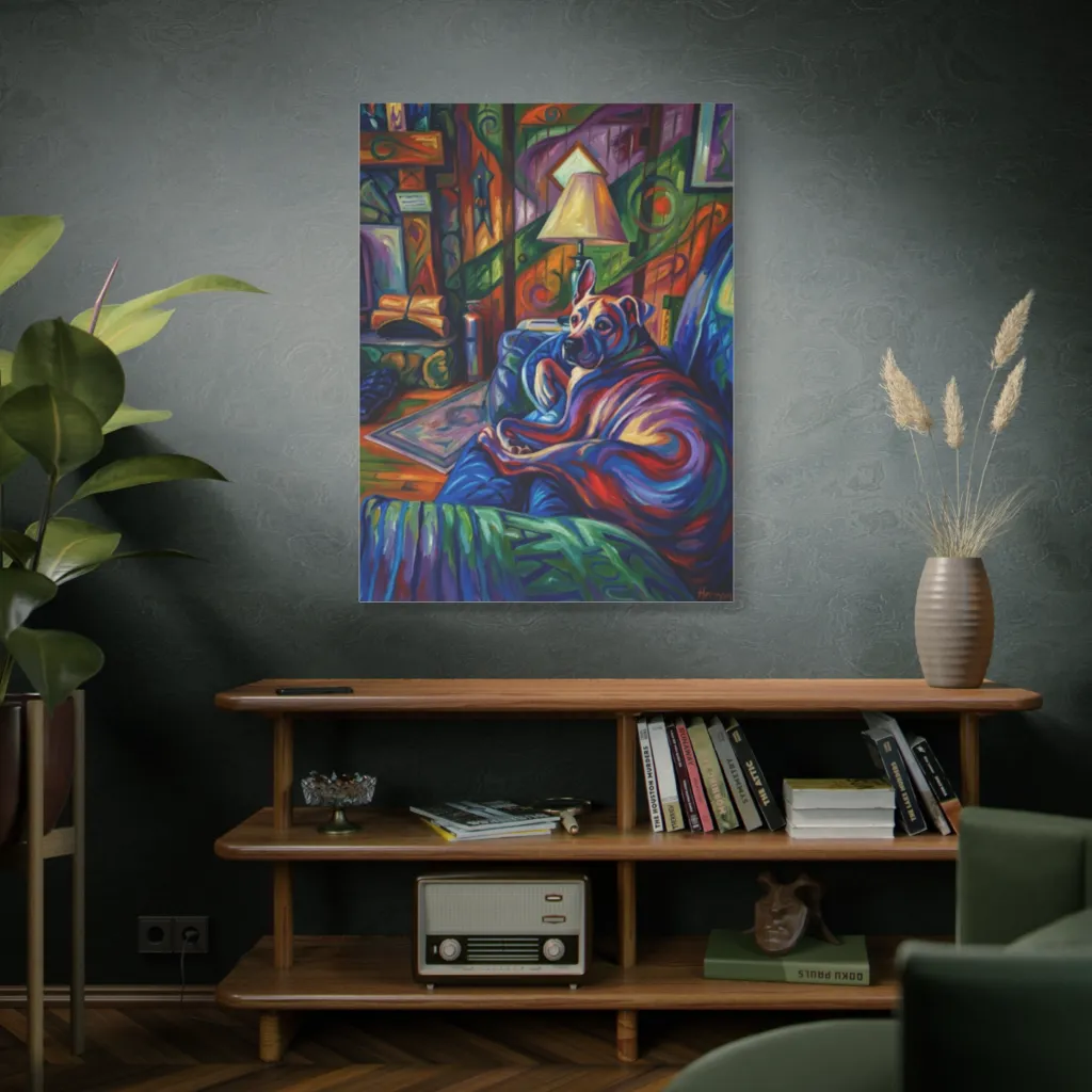 This vibrant, swirling portrait captures Herman the dog's contented lounge amidst a whimsically colorful, almost psychedelic room, where even the walls vibrate with joy.