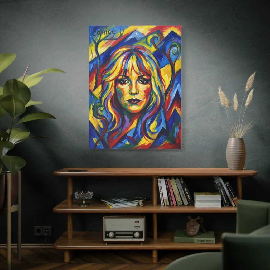 A vibrant, expressionistic portrait of a soulful woman explodes with bold color and energetic strokes, creating an intense, psychedelic mood. Janice looks ready to belt out a power ballad, her vibrant energy splashed across the canvas.