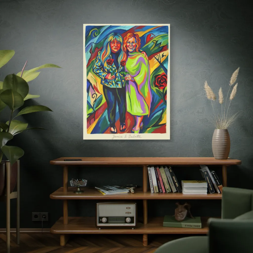 This piece brilliantly merges classic portraiture with a digital, expressionistic aesthetic. The bold, innovative use of color and technique elevates Janice and Babette's embrace into a strikingly contemporary vision. Innovative!