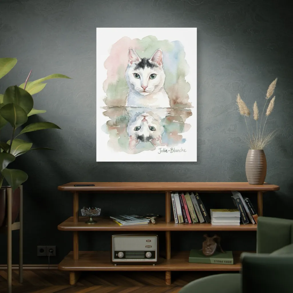 Jolie-Blanche, a watercolor masterpiece, thoughtfully observes her charmingly upside-down self, making this ethereal feline portrait purr-fectly whimsical.