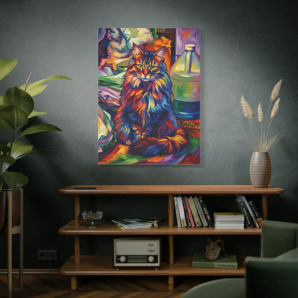 A fauvist feline bursts with vibrant, expressionistic colors, creating an intense, whimsical portrait amidst an everyday jumble. Kanin has unleashed such a riot of color, this dazzling cat practically radiates pure joy!