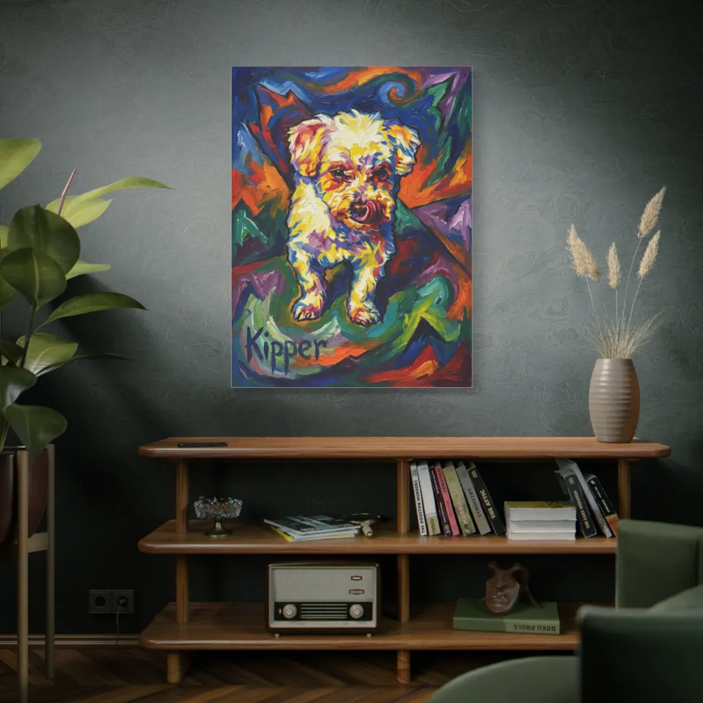 “Kipper, of Radiant Hues” is a masterful chromatic study. The saturated, impasto warm/cool balance perfectly amplifies Kipper's joyful, playful energy. Brilliant use of complementary hues creates exhilarating emotional resonance. Truly a vibrant, expressionistic delight!