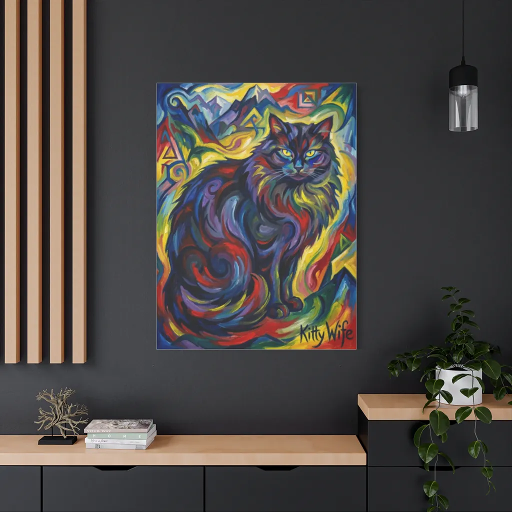 Kitty Wife's vibrant energy demands a focal point. Place it above a brushed brass bar cart in a chic lounge or anchoring a raw oak desk. Absolutely striking!