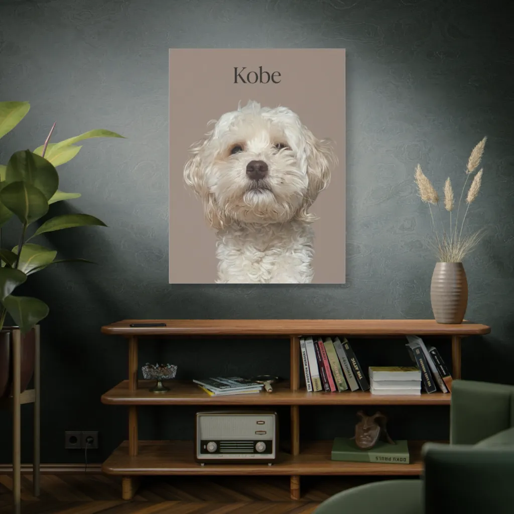 With soulful eyes and tousled fur, this minimalist portrait of Kobe the dog offers a heartwarming, playful appeal. Kobe's determined gaze suggests he's the MVP of fetching, always going for the win.