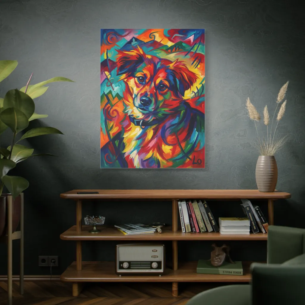 A kaleidoscopic explosion of fauvist color and bold strokes illuminates a soulful dog amidst abstract mountains, radiating vibrant joy. Lo painted this vibrant pup so colorfully, even a rainbow would wag its tail in envy.
