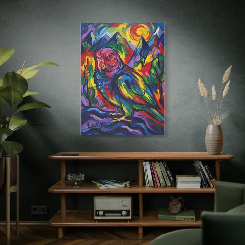 "Luey in Sunlit Splendor" masterfully blends impasto traditions with a modern, psychedelic digital aesthetic. The innovative rendering of Luey, amidst swirling sunscapes, redefines contemporary pet portraiture. Bold and brilliant!