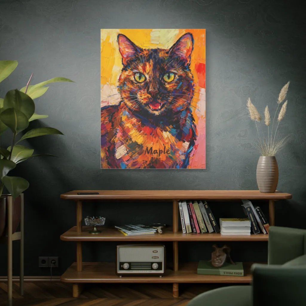"Maple's Autumn Glow" vibrantly captures her mischievous, curious spirit, mid-meow. The kaleidoscopic texture and poised stance beautifully reveal a soul ready to share secrets. Truly, a personality that glows!