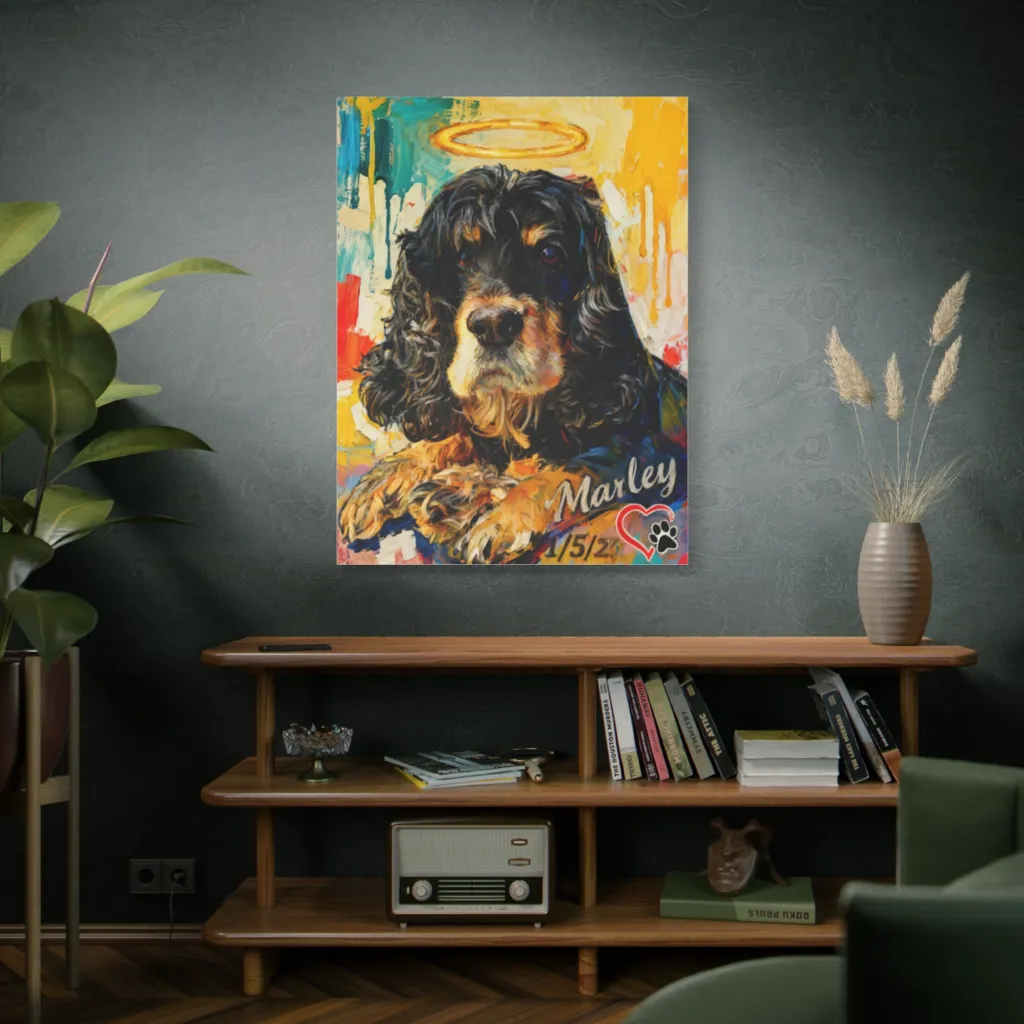 Vibrant impasto strokes depict a soulful, haloed dog on an energetic, drippy abstract background, brimming with heartfelt affection. Even with a halo, Marley's soulful gaze suggests he’s still plotting which cloud to nap on next.