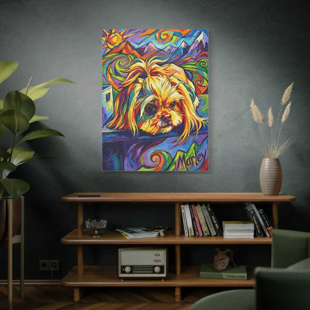 Marley's Alpine Reverie masterfully blends traditional portraiture with bold, digital expressionism. The vibrant, experimental brushstrokes offer a fresh, innovative take on pet art. Truly captivating.