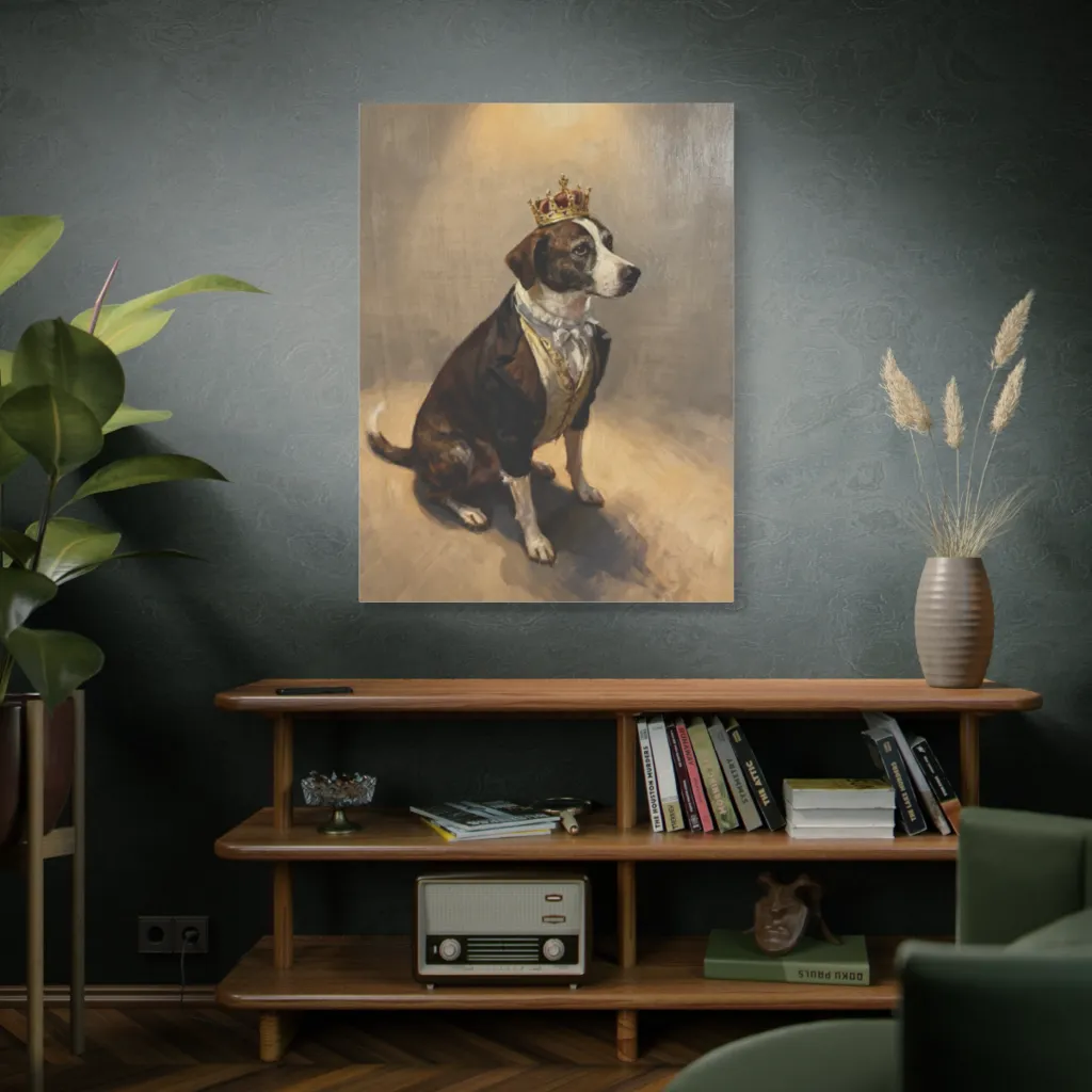 A painterly portrait of a serious, dapper dog in regal attire, exuding a charming, whimsical dignity.