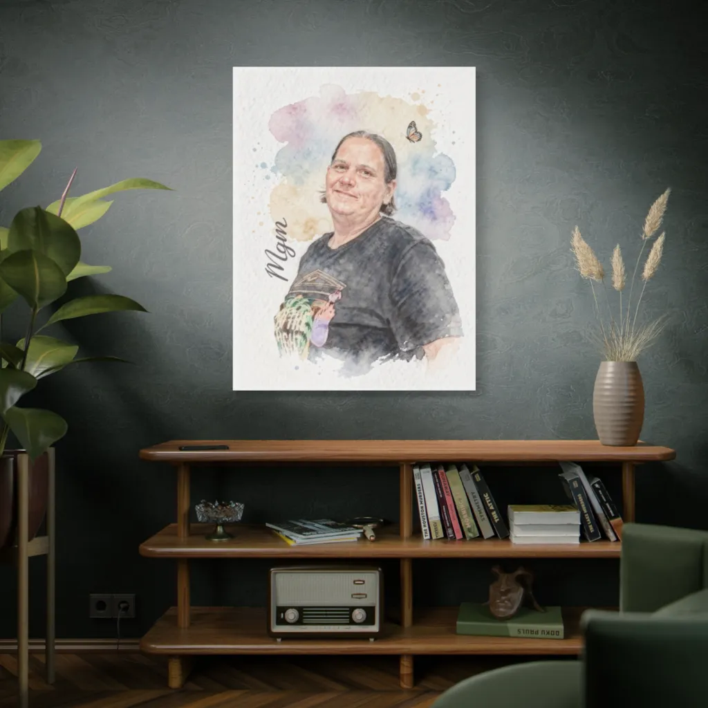 This tender watercolor portrait, framed by soft pastels and a hovering butterfly, warmly captures a gentle, serene spirit.