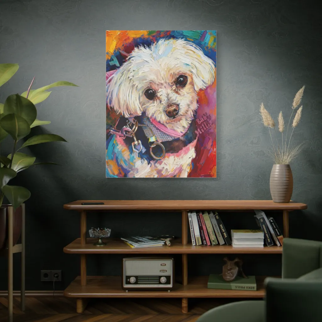 The impasto's visceral energy and Millie's geometric charm achieve tonal harmony. An avant-garde juxtaposition of fluff and demand, truly a Louvre-worthy oeuvre. One almost expects a treat.