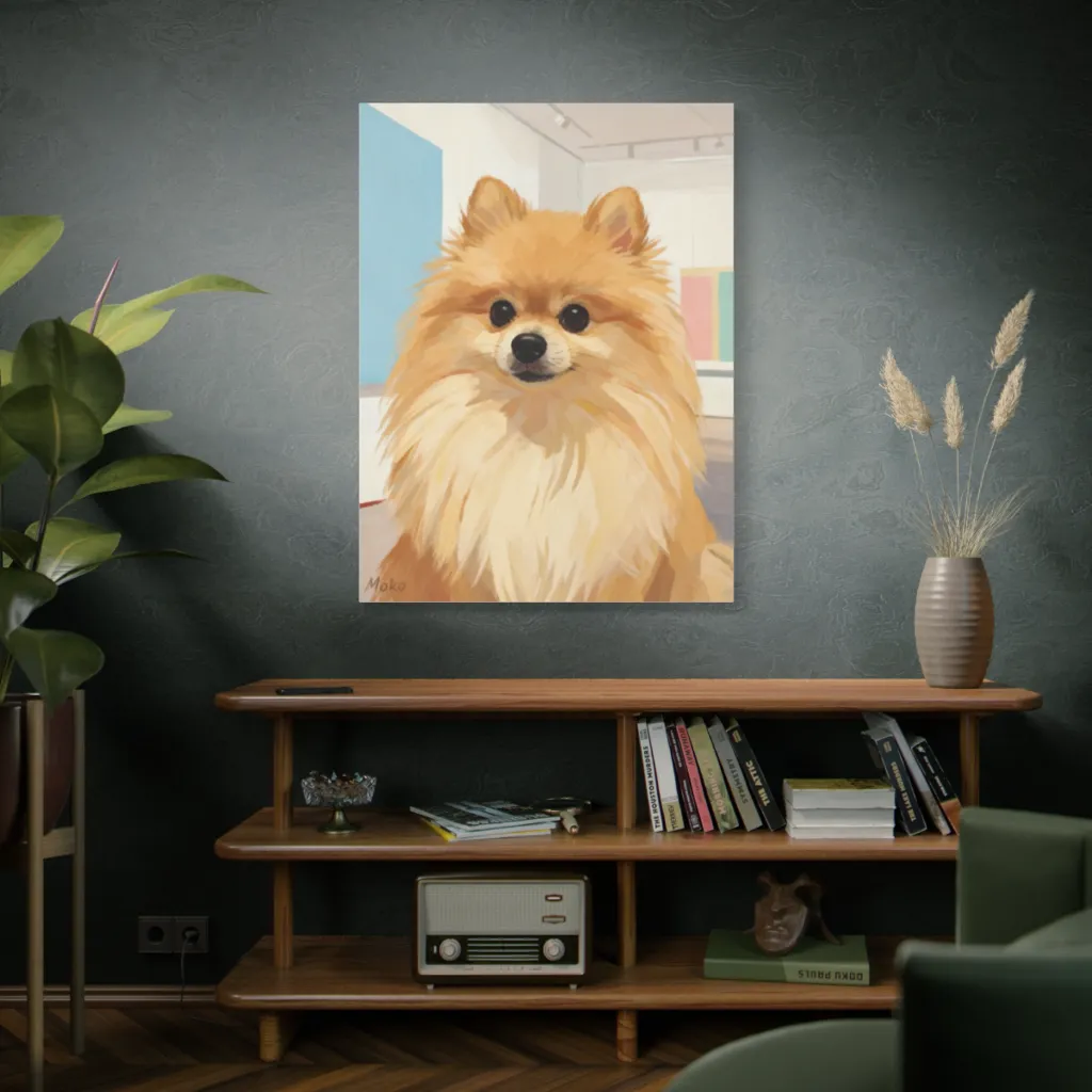Bold brushstrokes depict a fluffy Pomeranian holding court in a minimalist gallery, exuding an utterly charming and playful contemporary mood. Moko, the gallery's most discerning critic, clearly thinks his fluffy presence is the true masterpiece.