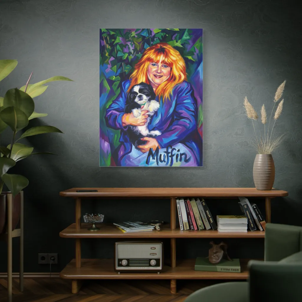 “Muffin in Blue” masterfully fuses expressionistic portraiture with a bold, digital aesthetic. The vibrant techniques modernize this classic subject, making a captivating statement on contemporary pet art. Truly innovative and visually striking!