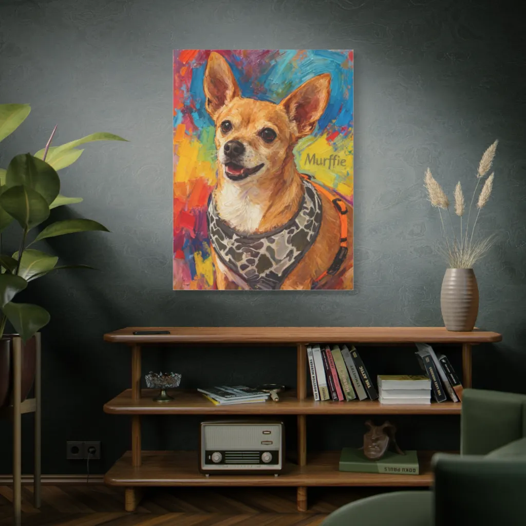 “Murffie in Vivid Hues” brilliantly uses saturated warm tones offset by cool chromatic splashes. This impasto riot perfectly conveys Murffie's cheerful energy, achieving vibrant, joyful harmony. A masterclass in emotional resonance through color theory.
