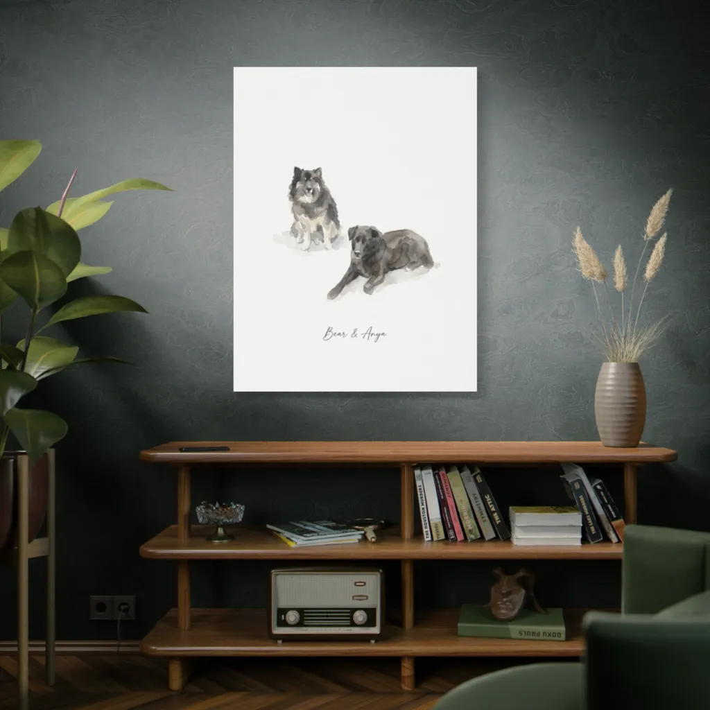 This charming watercolor features two beloved dogs rendered with a loose hand, exuding a gentle and heartwarming mood. Bear and Anya, captured in gentle washes, subtly remind us who truly owns the couch and our hearts.