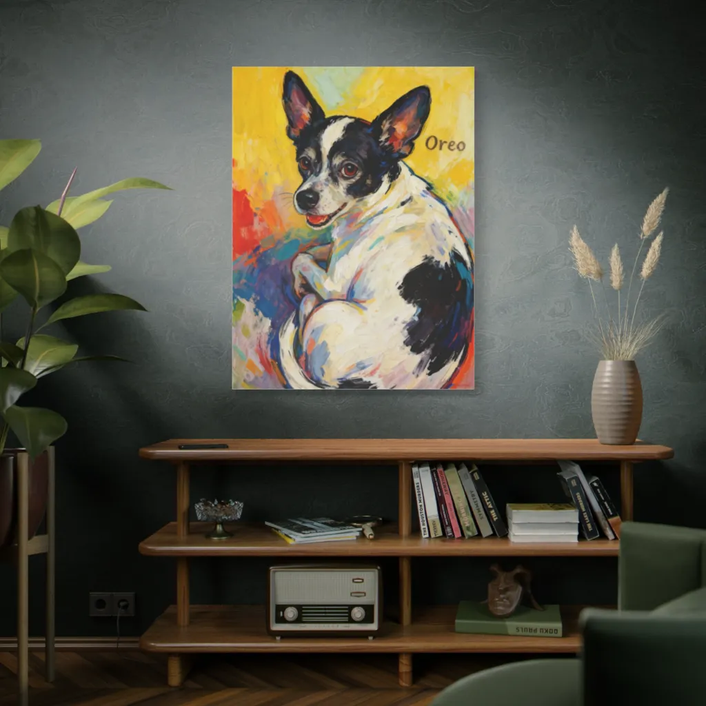 Oreo's alert stance and joyful gaze perfectly capture his charming, playful spirit. The vibrant impasto work truly reveals the soul of this delightful pup, making his unique zest shine through.