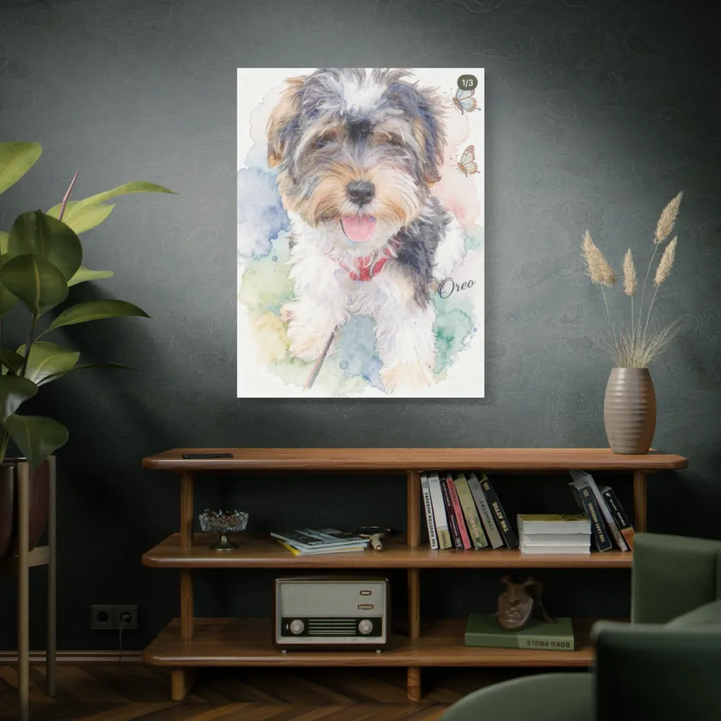 This piece brilliantly fuses traditional watercolor warmth with a modern, dynamic digital aesthetic. The whimsical splatters and crisp butterfly accents feel fresh and innovative, transforming a classic pet portrait into a contemporary, joy-infused digital experience.