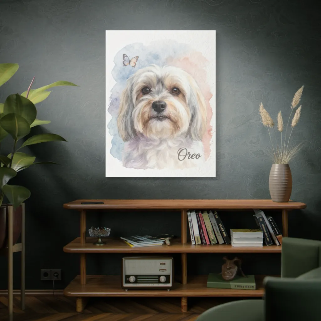 This delightful watercolor portrait captures an endearing fluffy dog with a butterfly, radiating a whimsical, gentle charm. Truly, this adorable Oreo looks even sweeter than a cream-filled cookie!