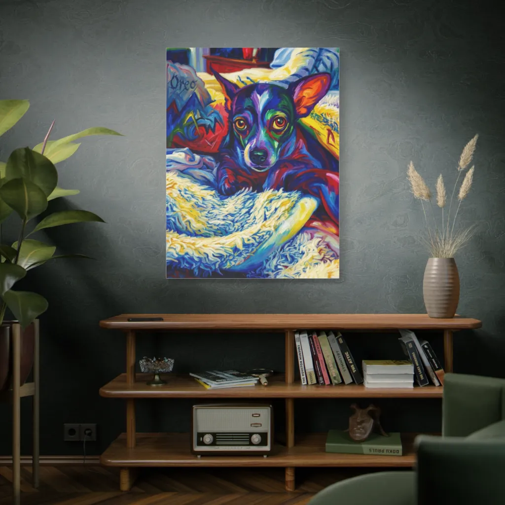 “Oreo’s Chromatic Reverie” explodes! Its saturated, complementary hues create electric chromatic harmony. The vibrant warm-cool balance amplifies Oreo's soulful gaze, resonating with a joyful, complex energy. Pure color theory genius, perfectly capturing the dog's unique spirit!