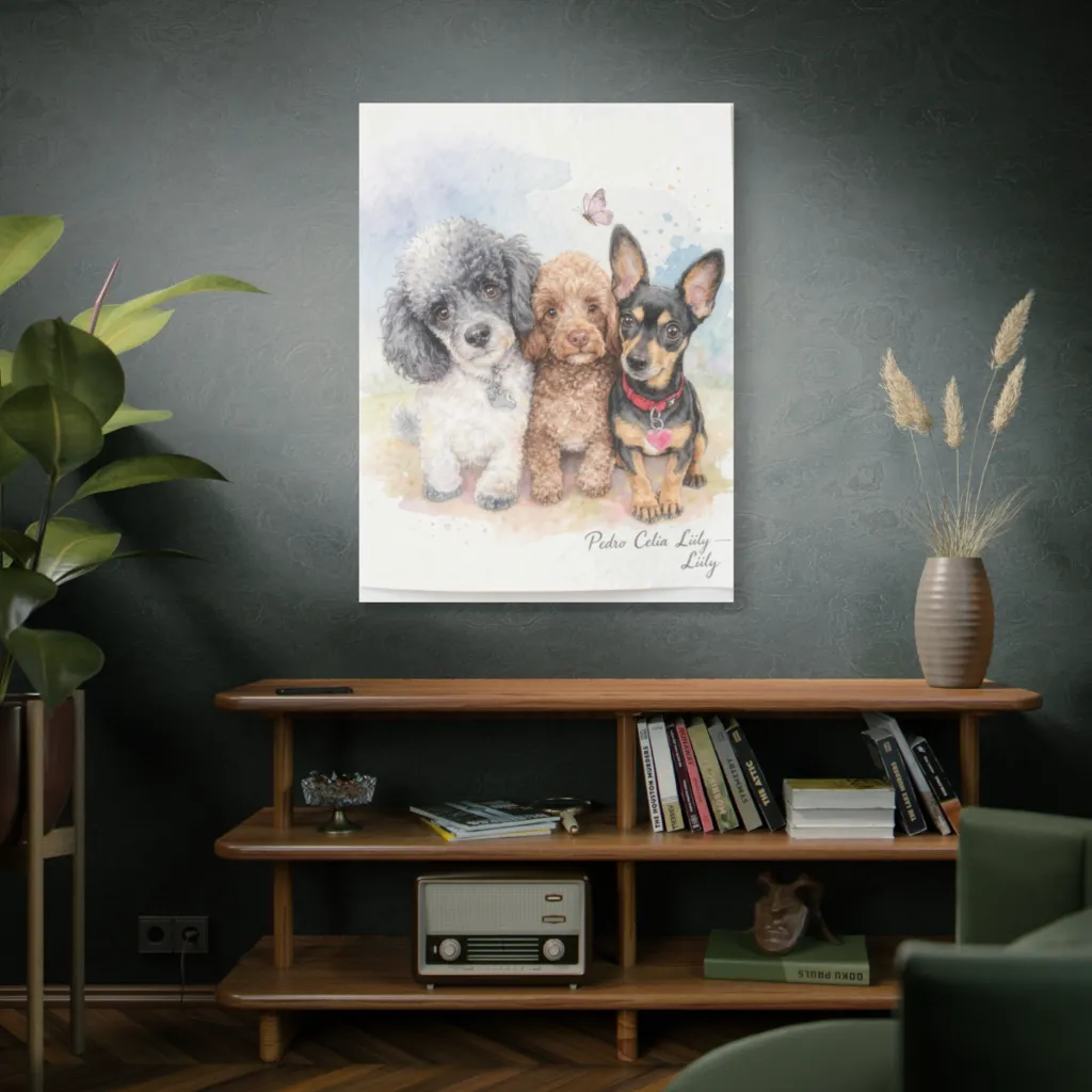Soft watercolor masterfully renders three fluffy, wide-eyed puppies in a whimsical, heartwarming portrait, chasing a tiny butterfly. Pedro, Celia, and Liily make this delightful watercolor portrait truly paw-some!