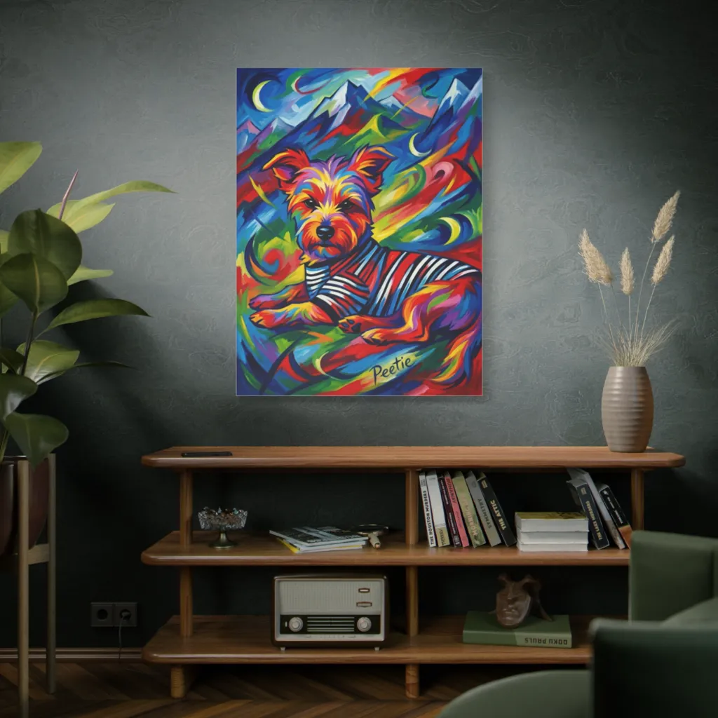 This piece brilliantly fuses traditional portraiture with a cutting-edge digital aesthetic. Peetie's psychedelic hues and cubist mountains are a bold, innovative take on pet art, bursting with electric energy. Truly visionary!