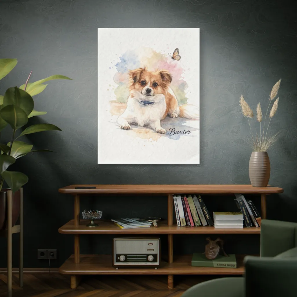 A vibrant, expressive watercolor captures a charming dog's gentle gaze, creating a whimsically serene moment.