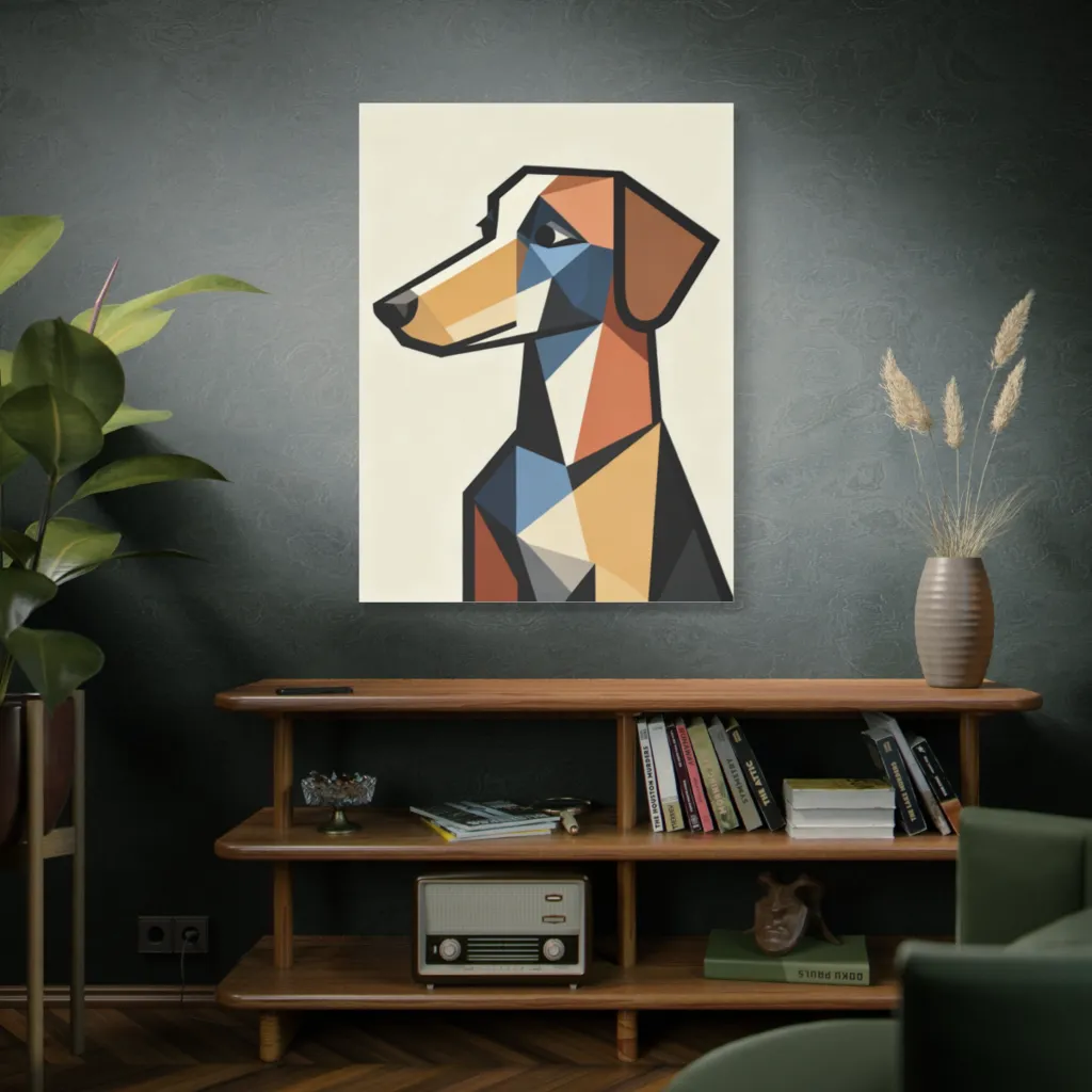 A sleek, geometric hound stares with sharp curiosity, its cubist form exuding modern, playful charm.