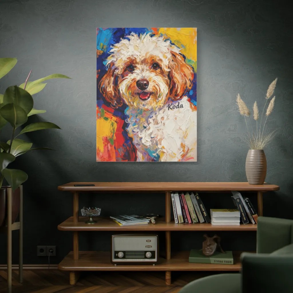 Koda's vibrant impasto palette explodes with joyful, high-saturation warmth. Complementary blues provide chromatic harmony, perfectly capturing his radiant puppy energy. Brilliant!