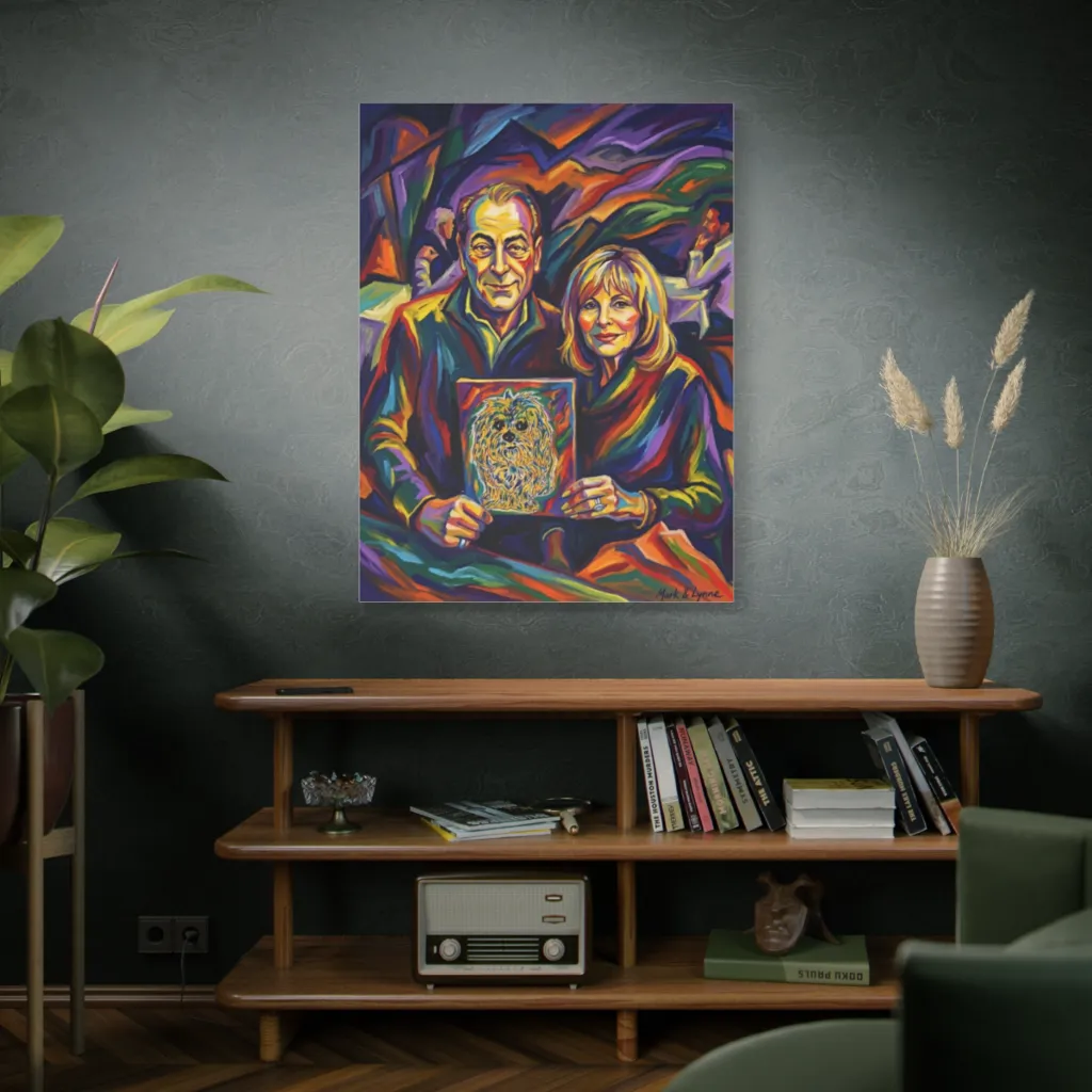 The vibrant, fractured palette bursts with chromatic joy, balancing warm and cool tones. Saturated hues brilliantly capture Mark and Lynne's abstract happiness, truly resonating with their companion's energy.