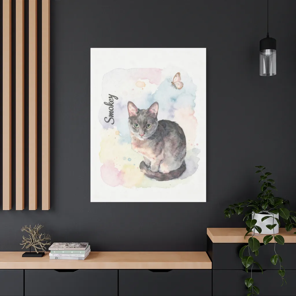 A charming watercolor portrays a watchful cat's serene gaze towards a fleeting butterfly amidst a dreamy, pastel wash. Smokey, with eyes of emerald, plots how to politely ask the butterfly for a closer inspection.