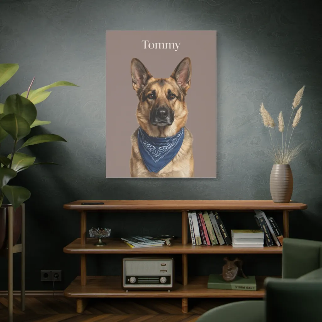 A vibrant, hyper-realistic digital portrait of a majestic German Shepherd in a snappy bandana exudes proud, attentive loyalty. Tommy’s poised gaze, sharp and ready, assures us he’s both a good boy and a serious fashion trendsetter.