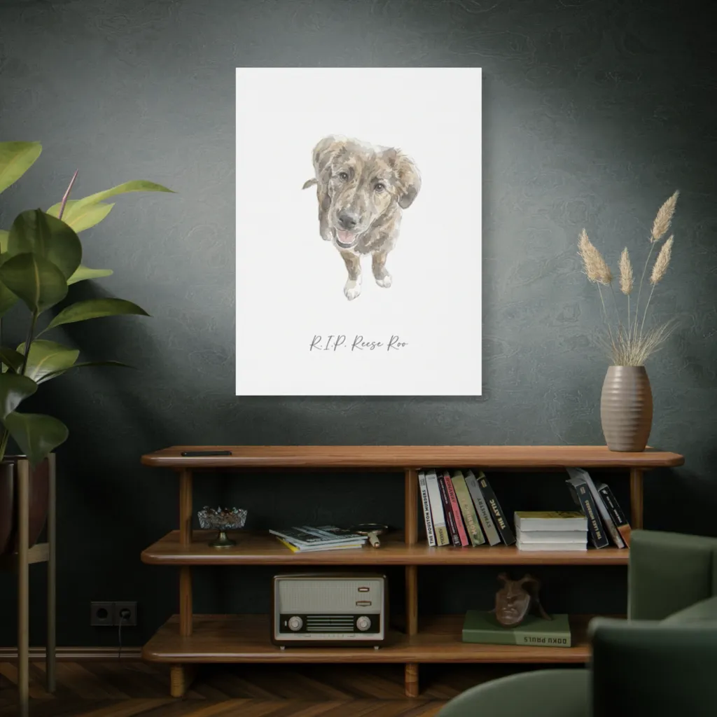 Reese Roo's gentle gaze beautifully captures a sweet, knowing soul. The soft watercolor highlights a loving spirit and distinctive, comforting presence. Truly a beautiful tribute to a cherished friend.