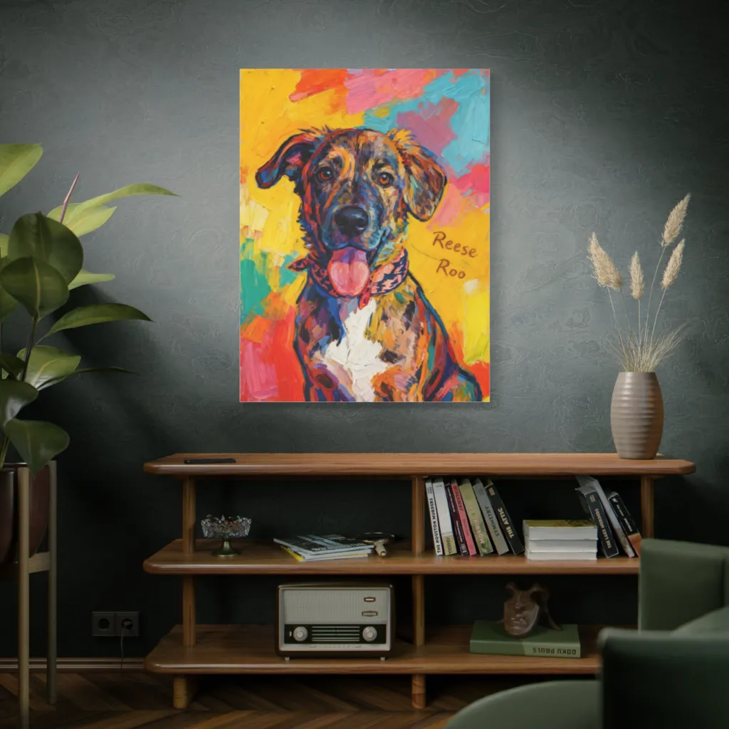 Bold impasto strokes paint a fantastically vibrant, tongue-out dog portrait, bursting with playful, rainbow-hued joy.