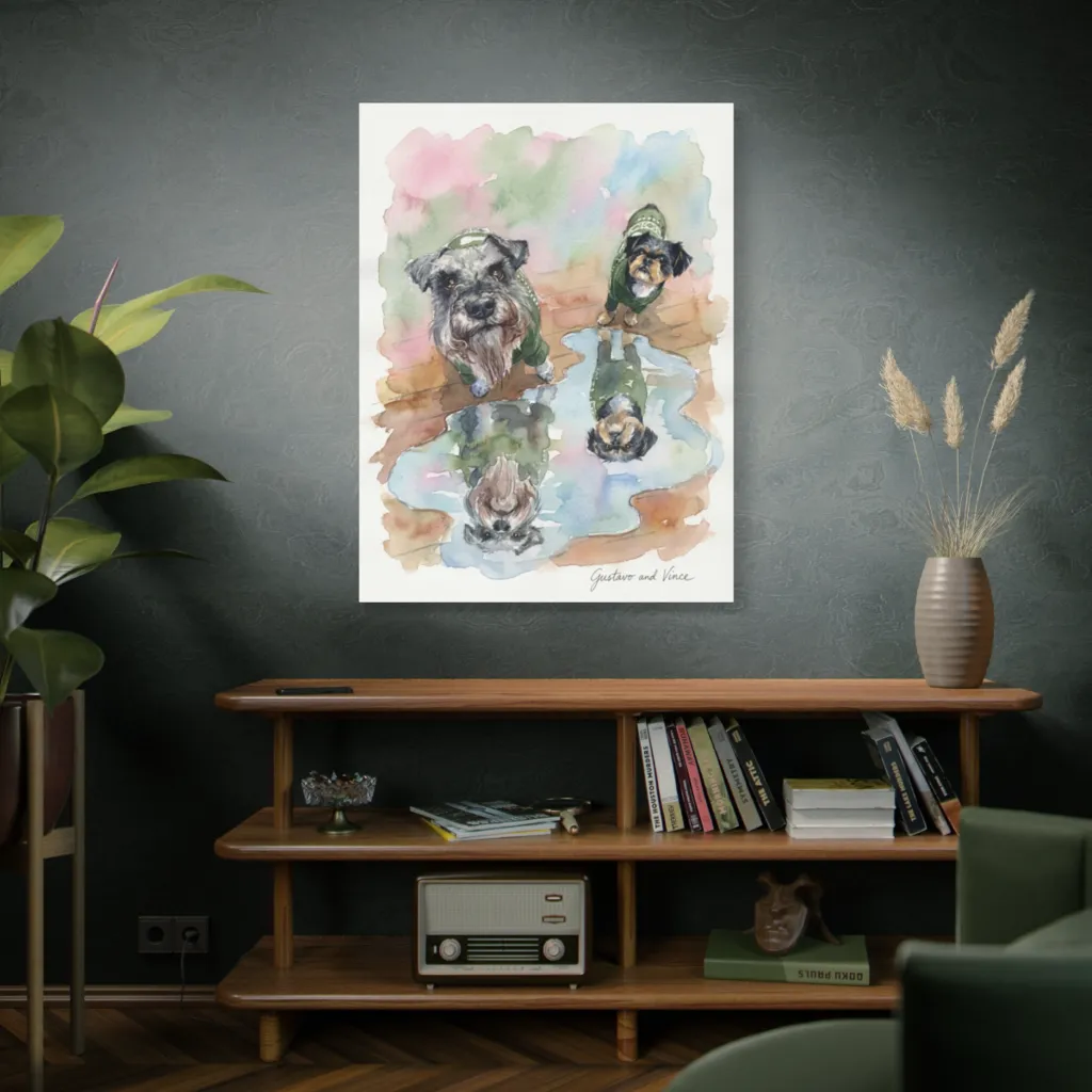 "Reflections of Gustavo and Vince" beautifully captures their unique, dapper camaraderie. Their endearing gazes and matching sweaters reveal a shared playful spirit and heartwarming bond. Truly special.