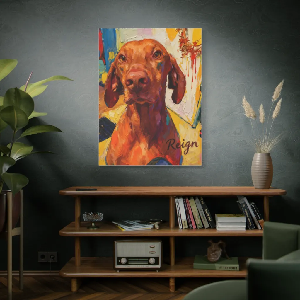 Reign's impasto brushwork achieves a visceral, almost sacred tonal harmony. The 'golden gaze' evokes an avant-garde juxtaposition of canine nobility and raw, expressive materiality. A divine masterpiece.