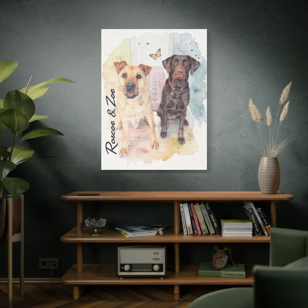 The watercolor's brushwork juxtaposes avant-garde whimsy with profound canine presence. A visceral tonal harmony elevates Roscoe and Zoe to a domestic masterpiece. Evocative, almost unsettling in its joyous simplicity, it demands Louvre contemplation.